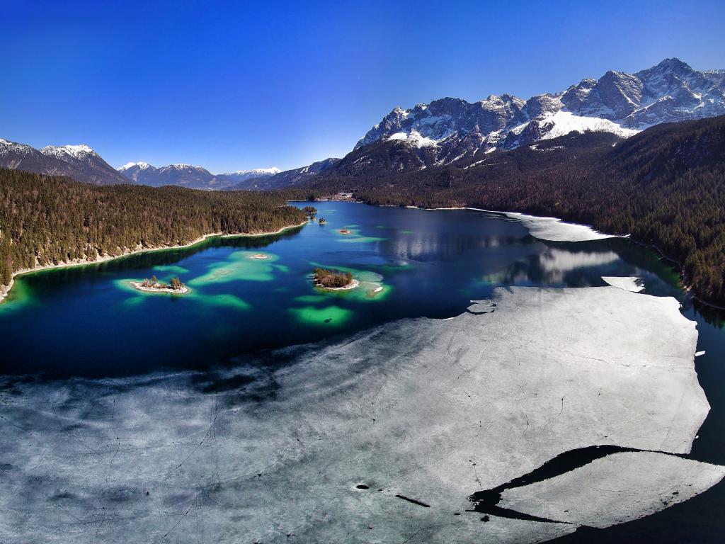Der Eibsee in Bayern mit seinem gruen schimmernden kristallklaren Wasser.