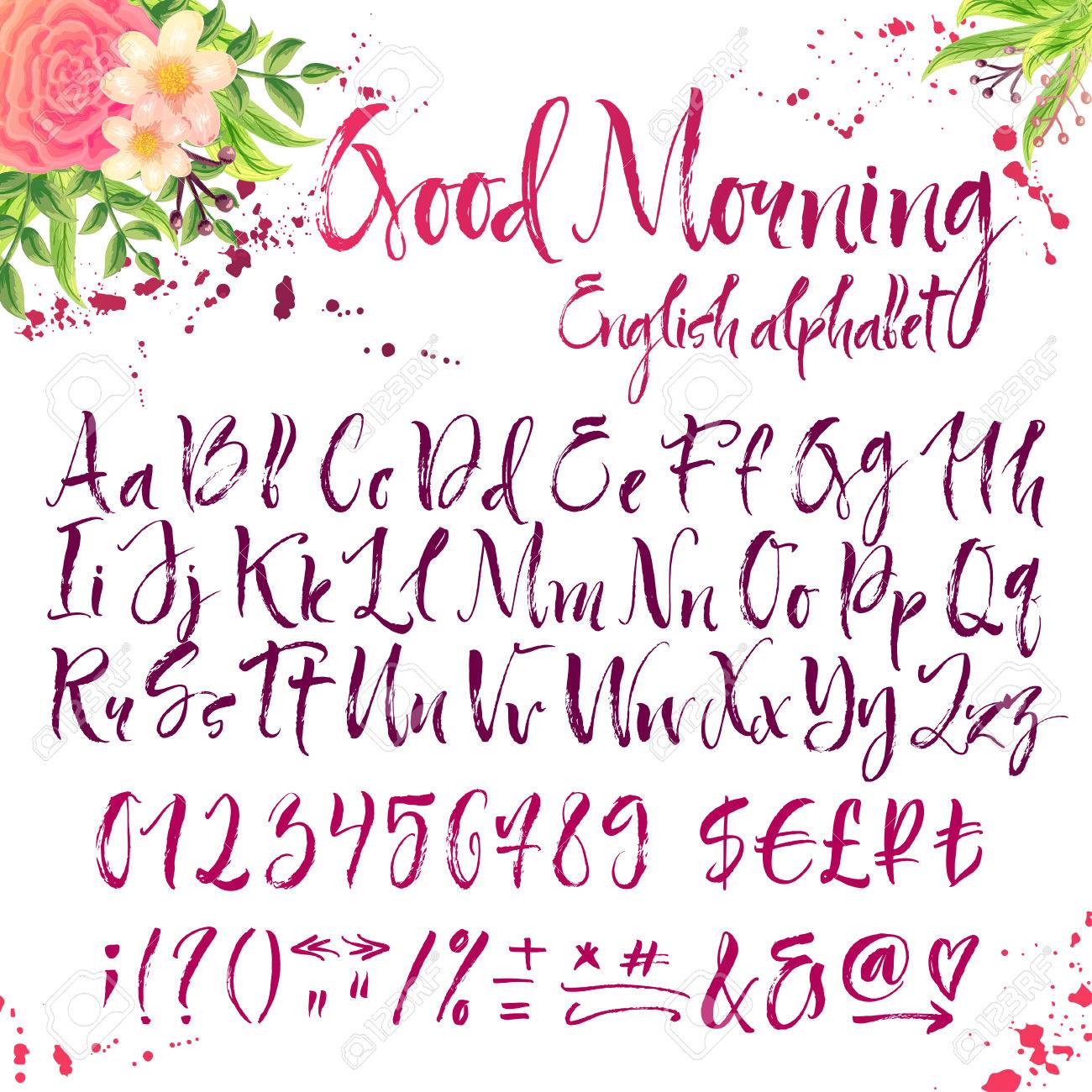 Kalli Englisch Alphabet Titel Ist Guten Morgen Blumenschmuck Und Inky Spritzt Auf Weissem Hintergrund Lizenzfrei Nutzbare Vektorgrafiken Clip Arts Illustrationen Image 58848470