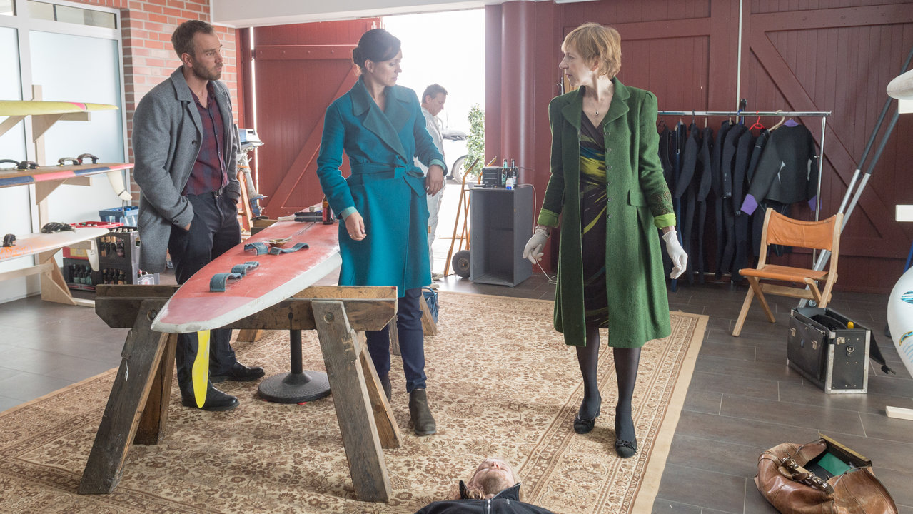 With Udo Kroschwald Martin Brambach Claudia Schmutzler Kai Maertens. 01 Der schoene Finn Staffel 15 Folge 01 Am Morgen findet Luise Barth den attraktiven Surflehrer Finn Hoffmann erschlagen in ihrer Surfschule. Schoene Aussicht S03E06 Photo Zweites Deutsches Fernsehen ZDF Marc Meyerbroeker.